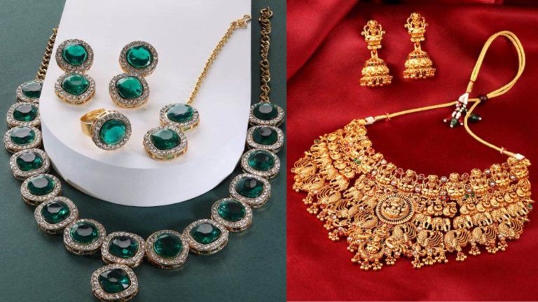व्ही-नेक ब्लाउजसह लेयर्ड चैन छान दिसतात. यासोबतच शॉर्ट लेन्थ नेकलेसही छान दिसतो. हा नेकलेस तुम्हाला खूप आकर्षक लुक देईल. व्ही नेकसह हेवी ज्वेलरी सहज परिधान करता येते.