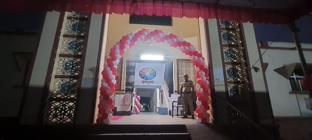 94- हिंगोली विधानसभा मतदारसंघातील मतदान केंद्र क्रमांक 286, सिटी क्लब हिंगोली कक्ष क्रमांक 1 सखी संचलित, महिला कर्मचाऱ्यांनी चालवलेले मतदान केंद्र गुलाबी फुग्यांनी सजवण्यात आले.